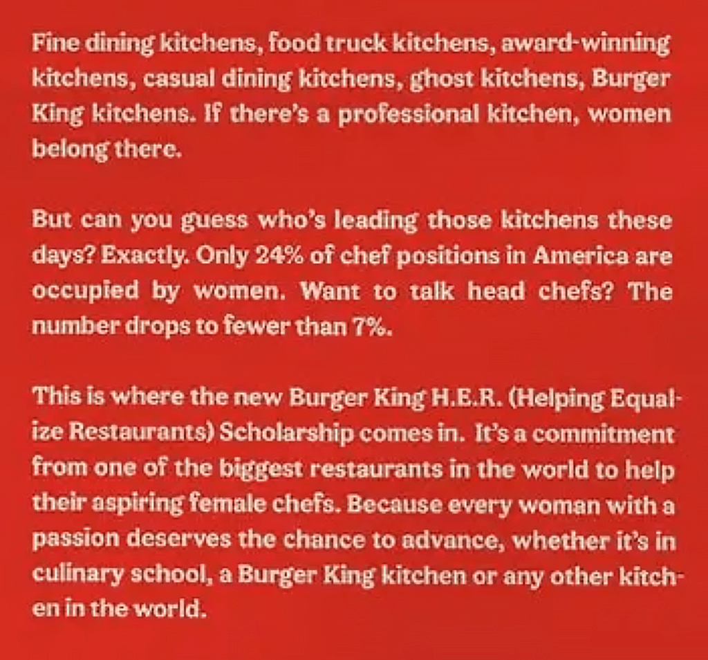 For anyone who doesn’t know, or didn’t read past the headline, Burger King was announcing the establishment of a new scholarship called H.E.R. (Helping Equalize Restaurants) to aid aspiring female employees who want to pursue careers as Chefs. The timing of its release coincided with International Women’s Day.